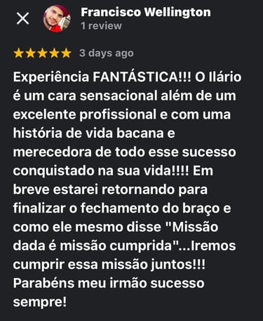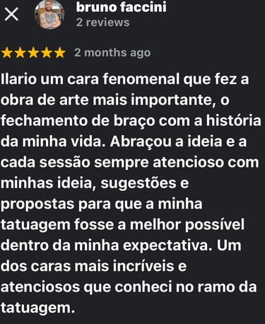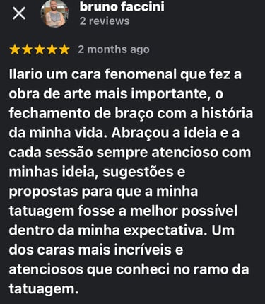 Eu sou o Ilario Reis, transformo história em Arte desde 2010, sempre focado no estilo de realismo avançado, já fiz inúmeros cursos de desenho e pintura pra evoluir ainda mais a técnica da tatuagem. Hoje tenho uma técnica establizada tanto no colorido quanto no preto e branco, com essa técnica mais apurada tatuo sem gerar muito trauma na pele do cliente obtendo uma cicatrização perfeita 100% das vezes.