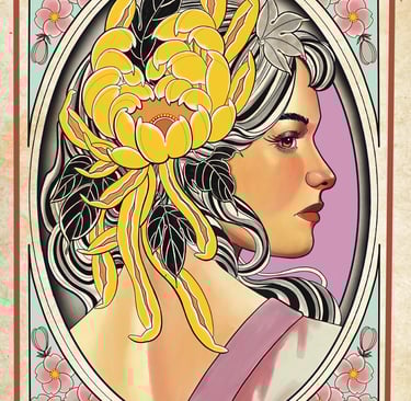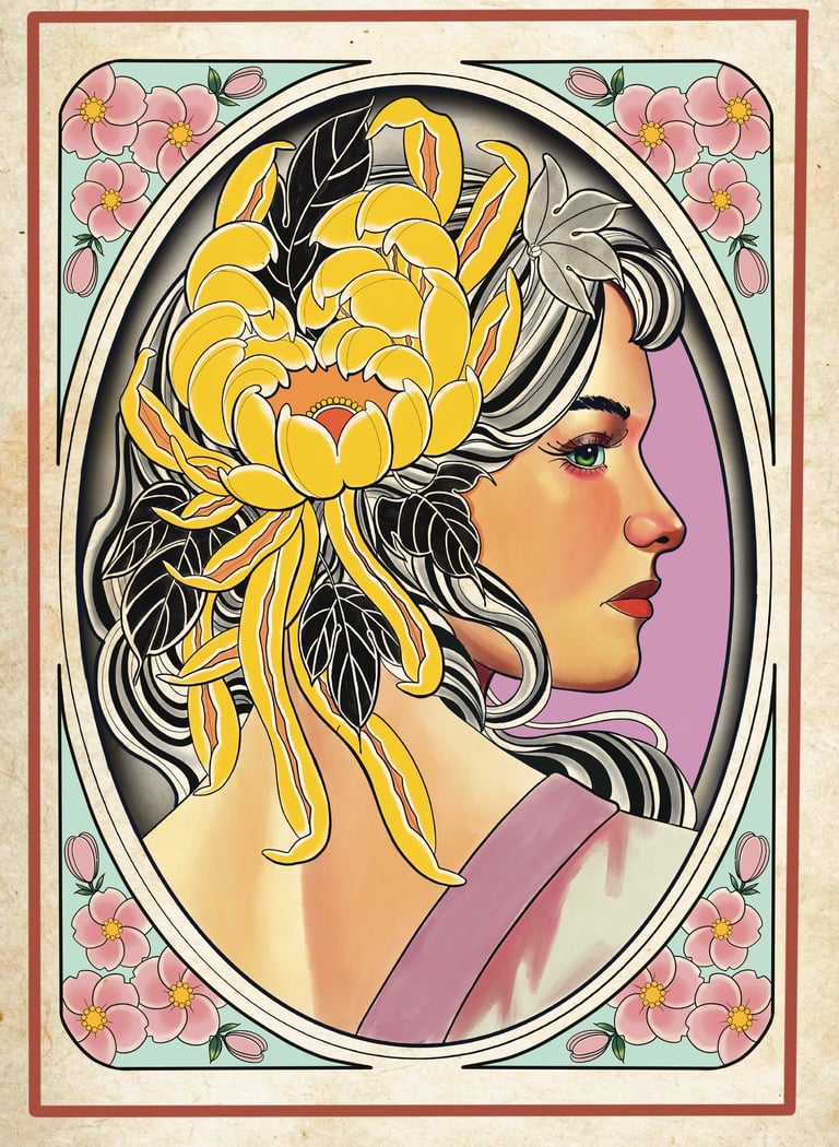 Nessa pintura quis exaltar a beleza e o olhar feminino, trazendo um pouco do estilo Art Noveau e fundindo com oriental Japonês.